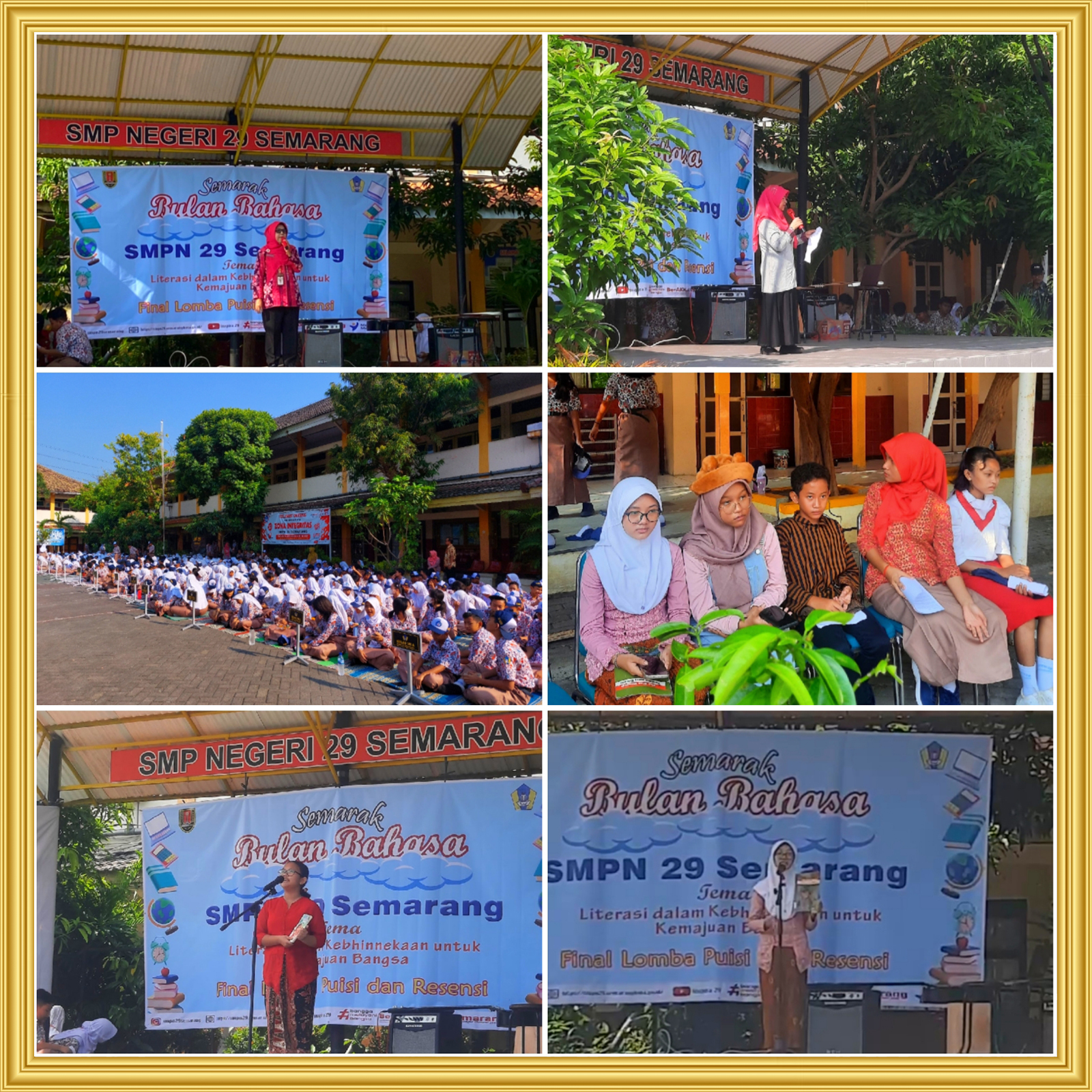 Pelaksanaan Lomba Baca Puisi dan Lomba Resensi di SMPN 29 Semarang dalam rangka memperingati bulan Bahasa dilaksanakan pada Hari Selasa 31 Oktober 2023 berjalan dengan meriah dan lancara, Tujuan dari Lomba Baca Puisi dan Resensi Buku ini adalah:Menghargai Kekayaan Bahasa: Memberikan apresiasi terhadap kekayaan bahasa Indonesia melalui membacakan puisi dan meresensi buku yang mengandung makna mendalam.Menggali Potensi Kreativitas: Mendorong peserta untuk mengembangkan kreativitas dan imajinasi dalam menyampaikan pesan melalui puisi dan resensi.Memperingati Bulan Bahasa: Menyelenggarakan kegiatan yang sesuai dengan tema Bulan Bahasa sebagai wujud peringatan dan penghormatan terhadap bahasa Indonesia.